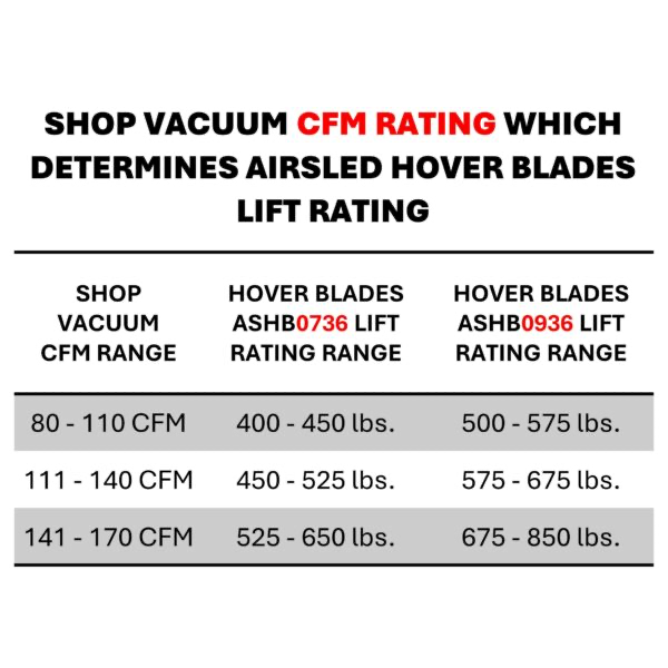 Unlock the secret power of your shop vacuum with Airsled's patent-pending Hover Blades. Simply connect your Hover Blades to the shop vacuum's blower port to create an Airsled "Appliance Mover" capable of lifting up to 850 lbs. depending on the Hover Blades model and your shop vacuum's CFM (cubic feet per minute) airflow rating. Airsled Hover Blades are designed to work with 2.5"D shop vacuum blower ports. If your shop vacuum's blower port is smaller than 2.5"D, we offer a universal iris adapter accessory (ACHB25). Airsled recommends only using CORDED shop vacuums. Battery-powered shop vacuums may not generate sufficient airflow which will significantly reduce Hover Blades lift rating and performance. Make sure to watch our Overview of Airsled Hover Blades video and the many Hover Blades HOW-TO videos on our website or YouTube channel to learn about this product and how to achieve optimal performance.